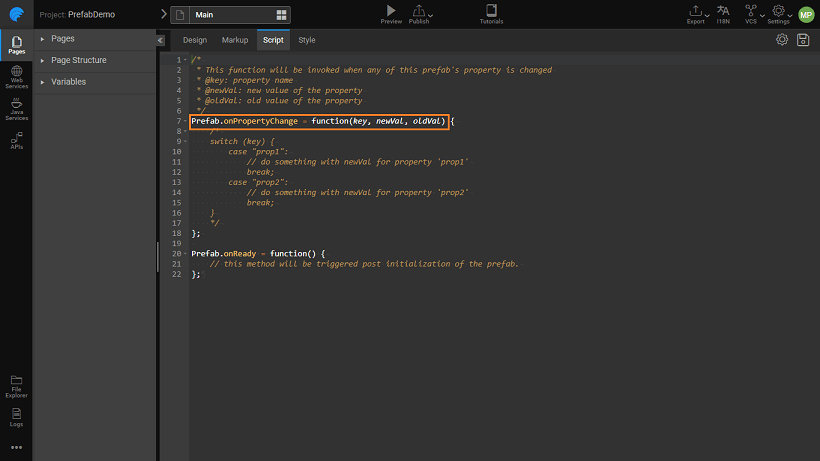 • Once the Prefab properties are set, a onPropertyChange event is created, which can be programmed from the Script.