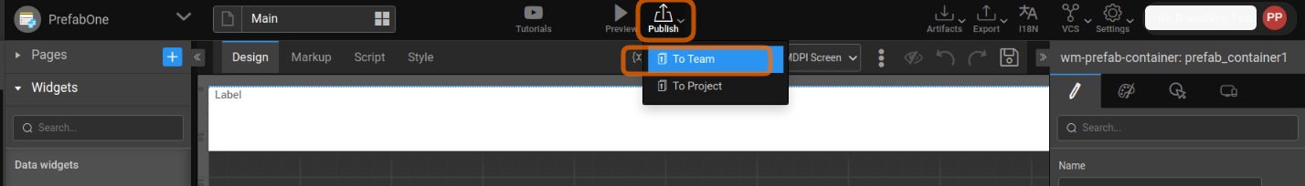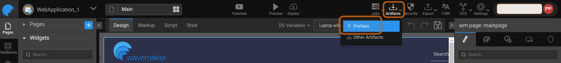 Using the Publish to Workspace option from the Main Menu listed under the app name, you can make your Prefab available across all projects within your workspace. Once Published the Prefab will be displayed in the Prefab section of the Widgets Panel under the category specified at the time of publishing. If you want to share the Prefab with another WaveMaker Developer, Export the Prefab as Zip. This zipped file can be imported from the Prefab section of the Project Workspace.