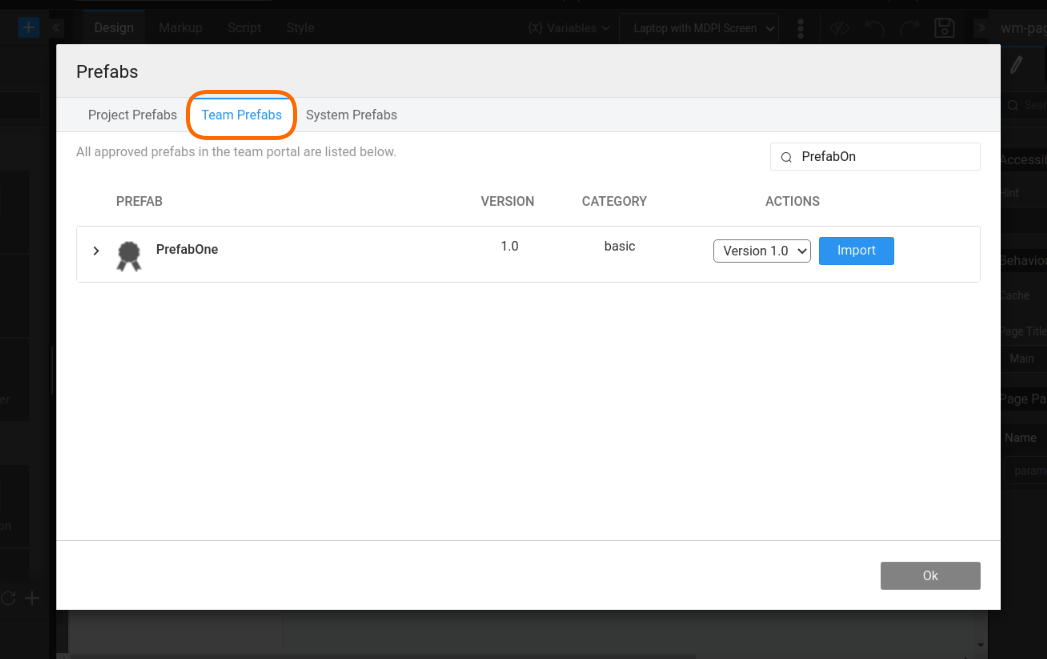 • After the Admin's approval, these Prefabs will be available for import from Prefabs dialog under Artifacts dropdown.