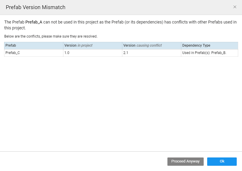 • Project P is using Prefab A ver 1.0 and Prefab B which internally uses Prefab A (ver 1.0).