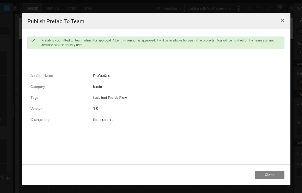 • Once the prefab is published, it needs to be approved by the Team Admin from Team Portal.