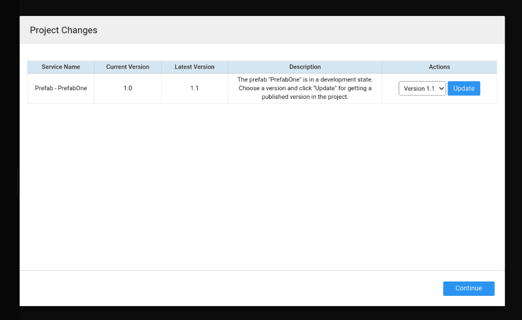 Updated Prefabs: By updating the Prefab version while publishing the Prefab will update the version and the latest version will be available across all the projects. When a project using this Prefab is opened,  the developer will be prompted to update the same within the project. When you open a project using the Prefab (i.e the Prefab was dragged and dropped onto the canvas) you will see a dialog asking you to update the Prefab You can choose to update or continue with the previous version. In case you choose to continue with the previous version, whenever you try to drag and drop the Prefab, you will be prompted to update the same.