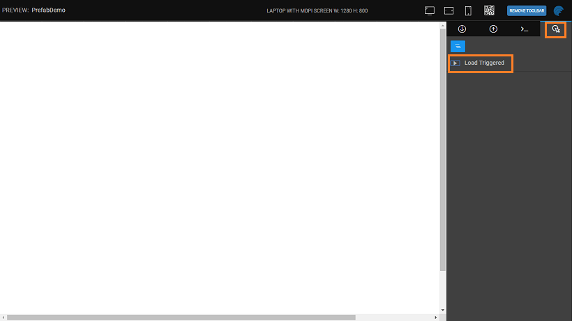 • on Load: this event is triggered whenever the page containing the Prefab loads or when the Prefab is dragged and dropped onto a page. This event is exposed to the Prefab user and can be further customized. It is displayed in the Events tab of the Prefab properties panel, after drag and drop in the project page.