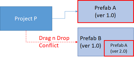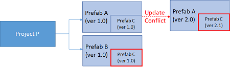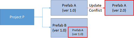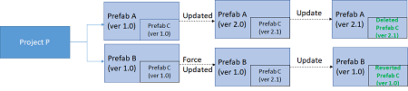 • Project P is using Prefab A ver 1.0 and Prefab B which internally uses Prefab A (ver 1.0).