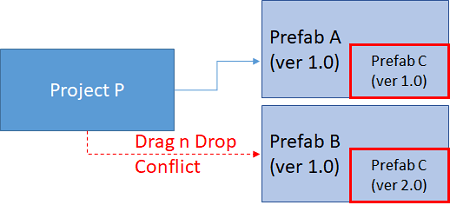 • Project P is using Prefab A which internally uses Prefab C (ver 1.0).