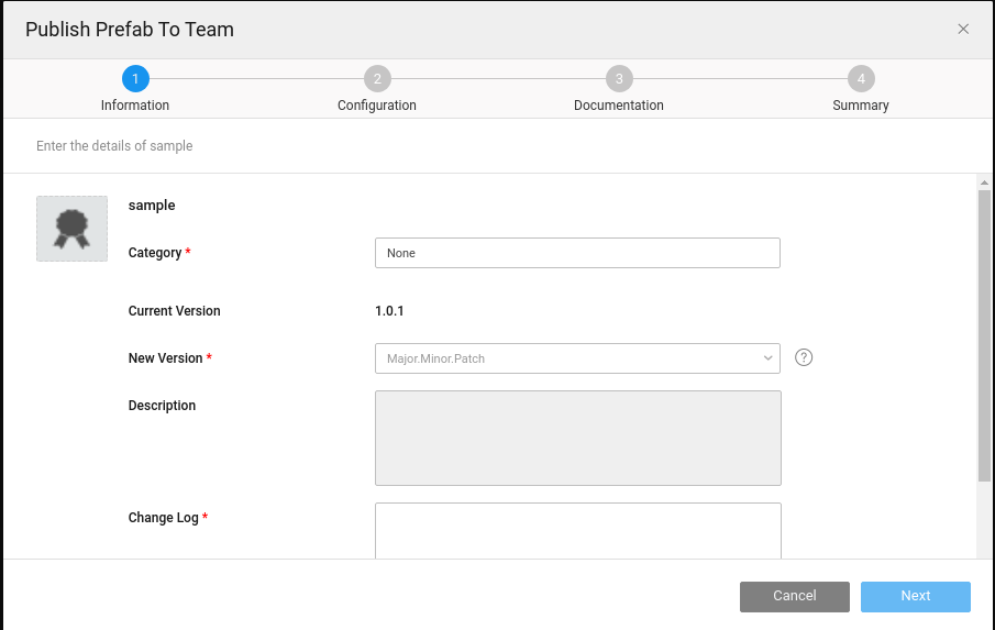 • Publish to Project: Prefab can be made available to a specific project in your project workspace or network for testing purposes only.