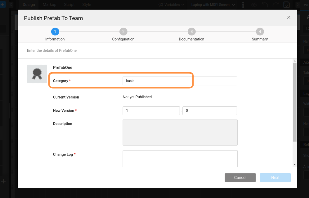 Updated Prefabs: By updating the Prefab version while publishing the Prefab will update the version and the latest version will be available across all the projects. When a project using this Prefab is opened,  the developer will be prompted to update the same within the project. When you open a project using the Prefab (i.e the Prefab was dragged and dropped onto the canvas) you will see a dialog asking you to update the Prefab You can choose to update or continue with the previous version. In case you choose to continue with the previous version, whenever you try to drag and drop the Prefab, you will be prompted to update the same.