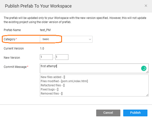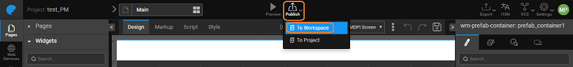Using the Publish to Workspace option from the Main Menu listed under the app name, you can make your Prefab available across all projects within your workspace. Once Published the Prefab will be displayed in the Prefab section of the Widgets Panel under the category specified at the time of publishing. If you want to share the Prefab with another WaveMaker Developer, Export the Prefab as Zip. This zipped file can be imported from the Prefab section of the Project Workspace.
