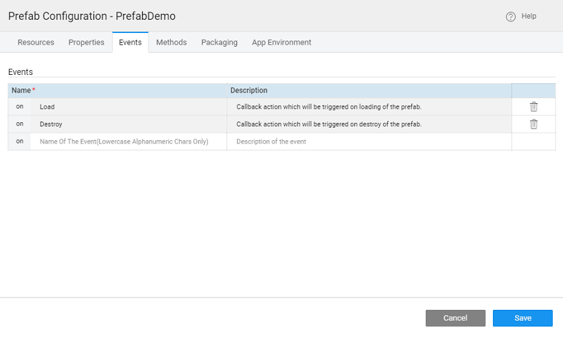 You can define events that can be handled by the developers using the Prefab. These events will be exposed under the events tab when the developer uses the Prefab, the developer can handle these events as per their requirements. By default, two events are defined - onLoad and onDestroy which will be triggered when the Prefab is loaded and deleted, respectively, from the app. Each Event will have the following properties that can be set: