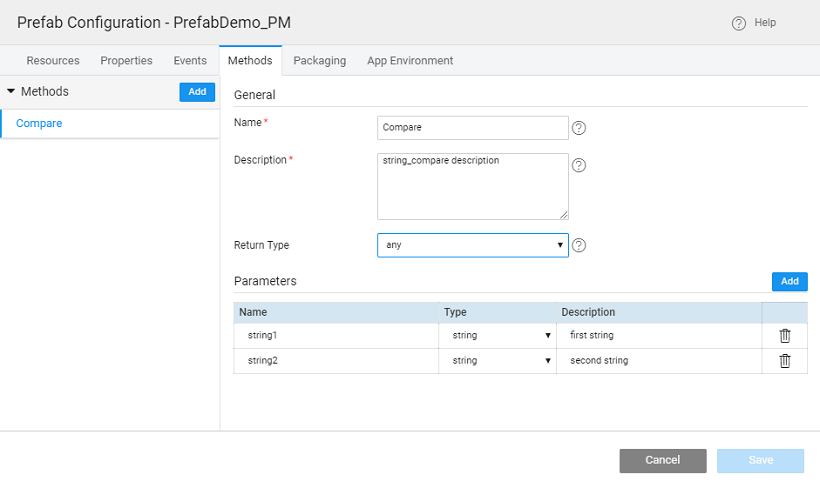 • Description of the method. This will be used in the generation of the documentation for the Prefab while publishing;