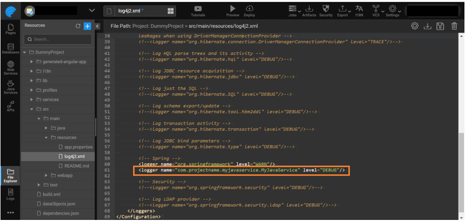 • This change aligns with the root level specified in the log4j2.xml file, which is set to INFO by default in WaveMaker's generated log4j2.xml.