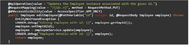 Each of the layers performs its function and delegates the call to the next layer in the chain. For example, after the unmarshaling of the JSON data to the model, and authorization checks, the REST layer delegates the call to the service layer, and more.