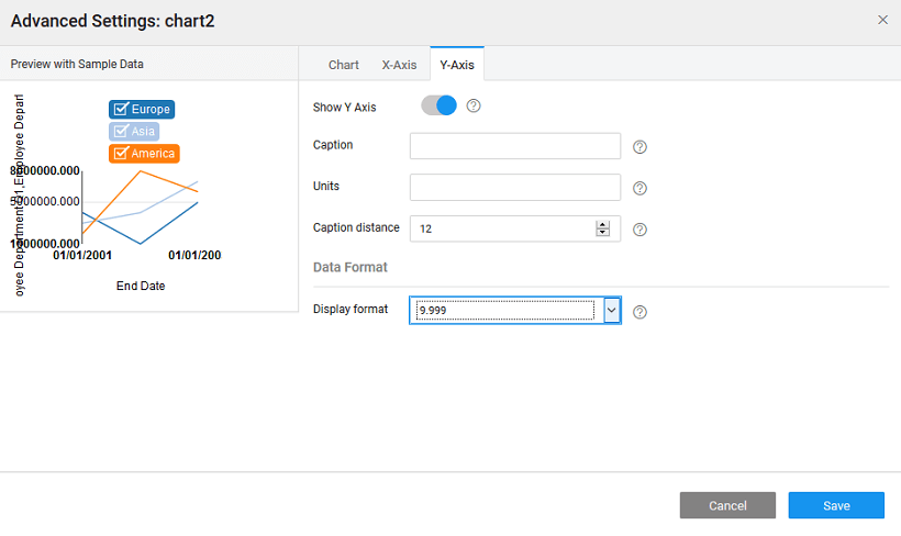 • Layout of the values can be defined in terms of location, value format, caption for line charts  and more