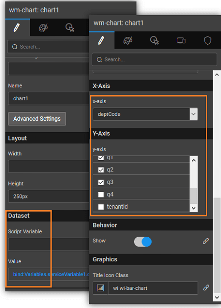 The X-Axis and Y-Axis values can be set to the fields from the data source, the chart is bound to.