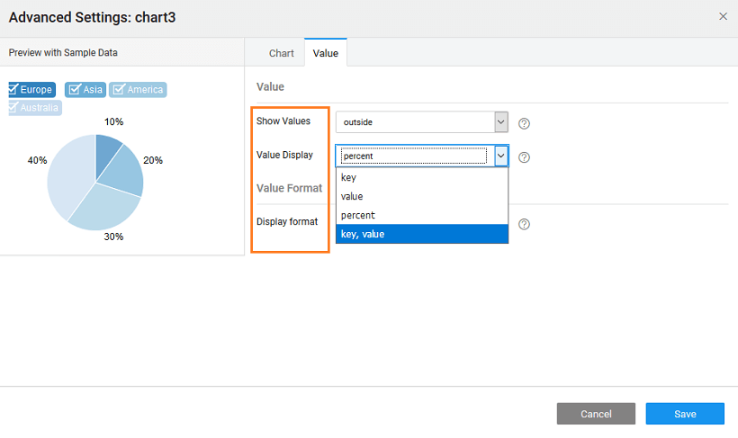 • the Value to be displayed - as key, value, percent (default) or key-value pair