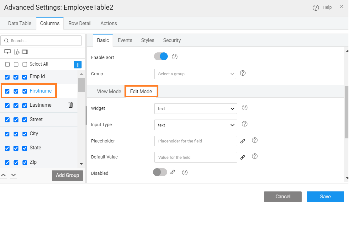 - Value Expression - You can write a custom expression to change the display setting for a table column. The expression needs to follow AngularJS conventions for binding. A sample expression is given which can be enhanced as per the needs of the application.