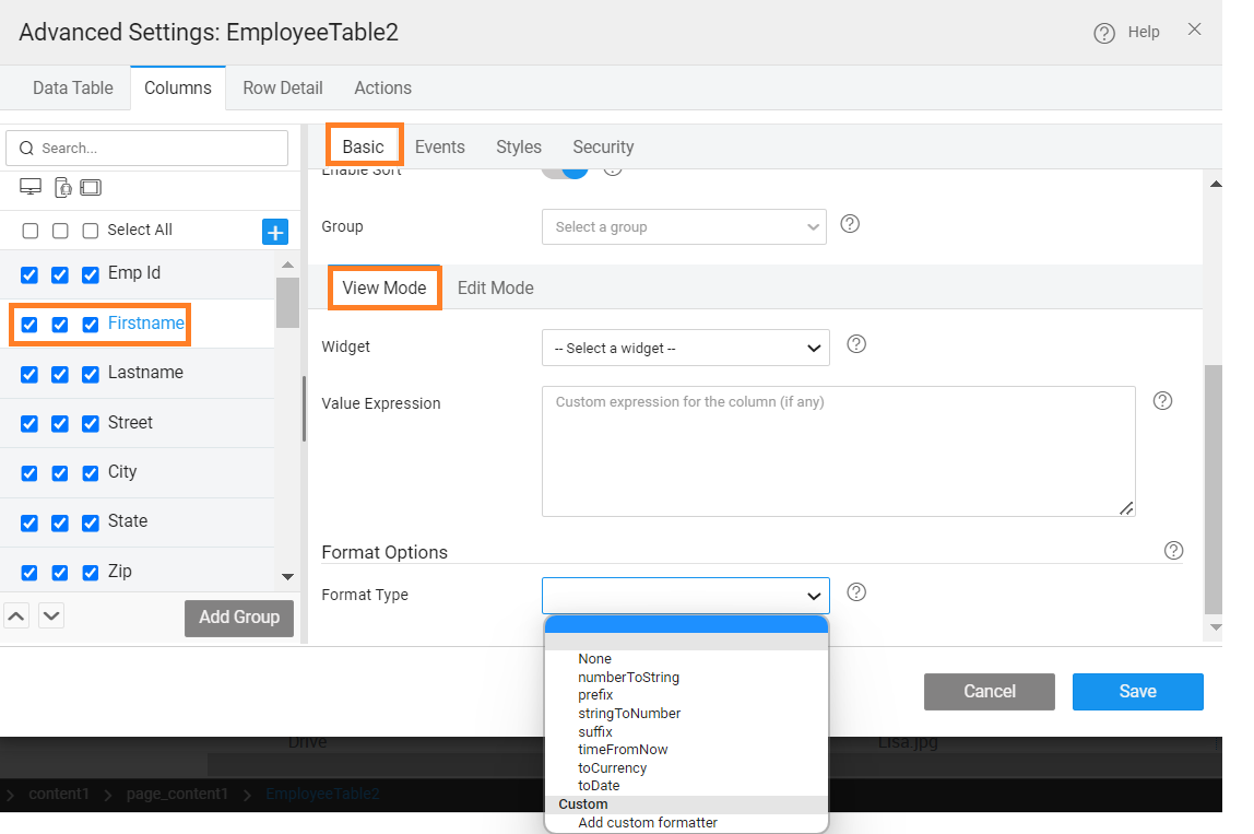 Format Options enables you to define the display format of the column at runtime. The options include toDate, toCurrency, prefix, suffix, and srtingtoNumber. Be aware that these format types selected are only for display purpose. During runtime, edit row will display the values as defined in the data source.