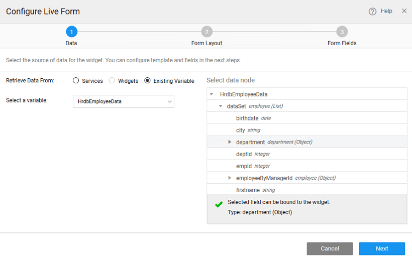 There can be different scenarios to deal with when configuring your Live Form Widget with a data source. The data source can be in the form of database CRUD variables or from an another widget, usually Data Table, on the page.