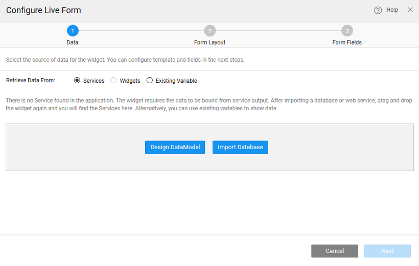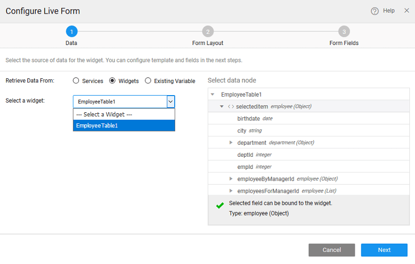 There can be different scenarios to deal with when configuring your Live Form Widget with a data source. The data source can be in the form of database CRUD variables or from an another widget, usually Data Table, on the page.