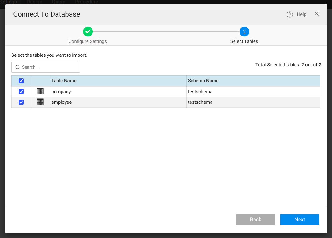 2. Select the desired tables to be imported and click on the Next button. This will now automatically generate the CRUD APIs for the select entities. The imported tables can be viewed from the DB designer.