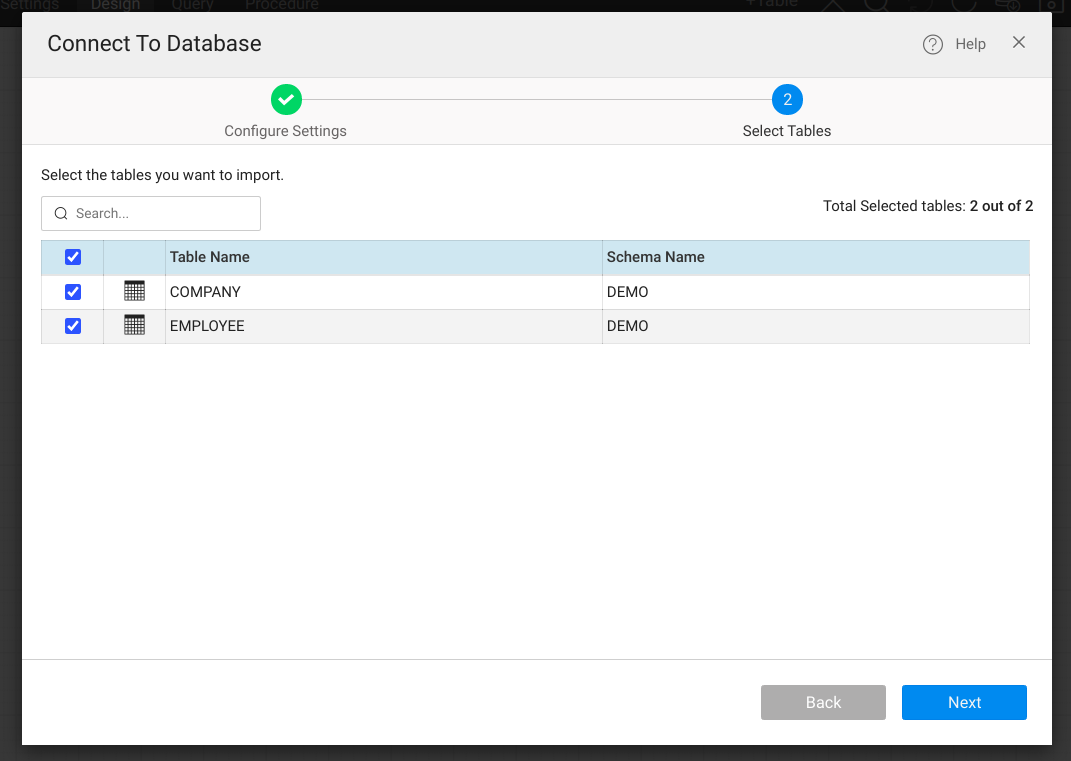 2. Select the desired tables to be imported and click on the Next button. This will now automatically generate the CRUD APIs for the select entities. The imported tables can be viewed from the DB designer.