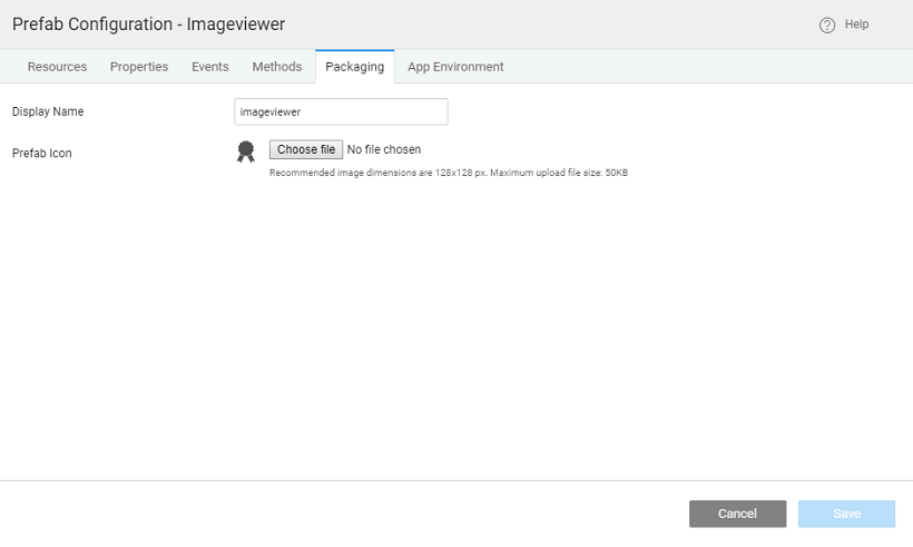 1. You can set the group and icon to be associated with the Prefab from the Packaging section. This will be displayed in the Widget toolbox of the apps after Publishing the Prefab (next section).