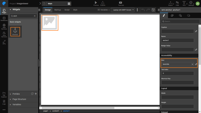 • Drag and drop an Anchor widget onto the canvas.