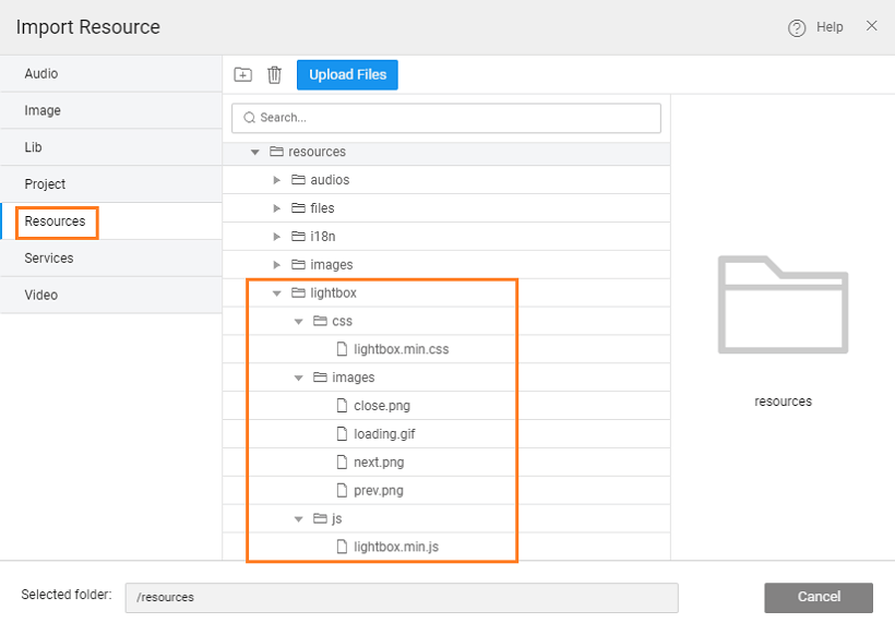 5. Upload the following files to their respective folders - lightbox.min.js, lightbox.min.css and four images. You will find these files in the respective folders from the extracted folder lighbox2-master/dist folder.
