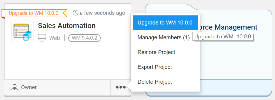 All the apps currently using the older platform versions will start displaying a label with an alert message "upgrade to WM 10.0.0" on the project card. Clicking on the upgrade to WM 10.0 will create a copy of your project.