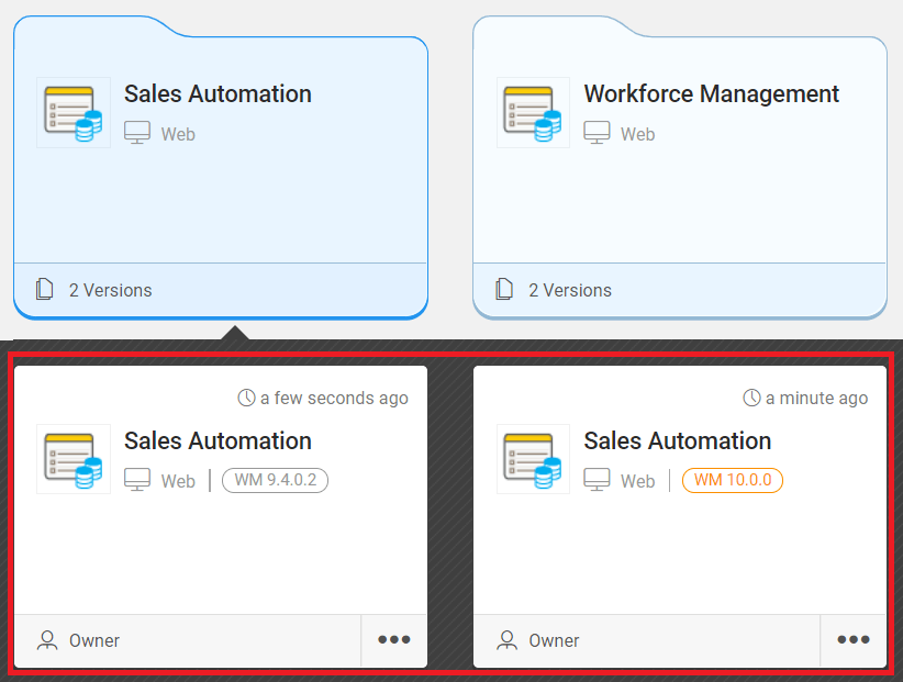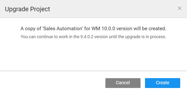 All the apps currently using the older platform versions will start displaying a label with an alert message "upgrade to WM 10.0.0" on the project card. Clicking on the upgrade to WM 10.0 will create a copy of your project.