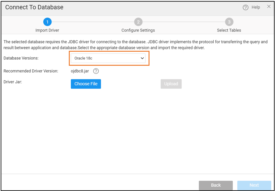 1. Upload the Driver Jar and click Next. For further configuration details, see Connect to Database.