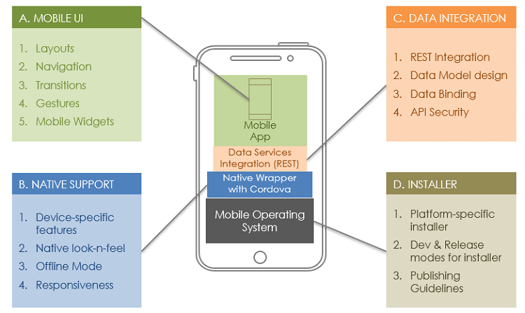 1. Building Mobile UI using layouts, adding workflow with the help of events supporting navigation, transitions, and gestures. Mobile specific widgets allow you to take advantage of the device features