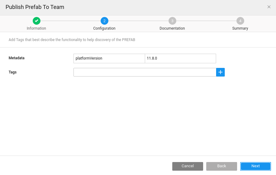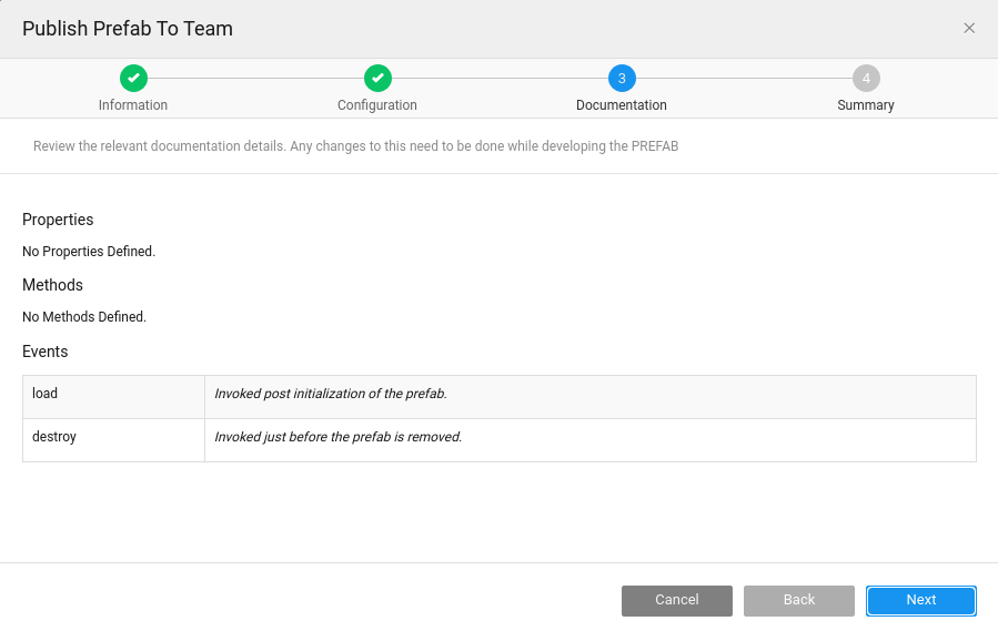 1. Documentation (only for Prefabs): This is populated automatically by the platform, from the Configuration Settings entered at the time of the Prefab development. Any changes to this need to be done at the Prefab development time.