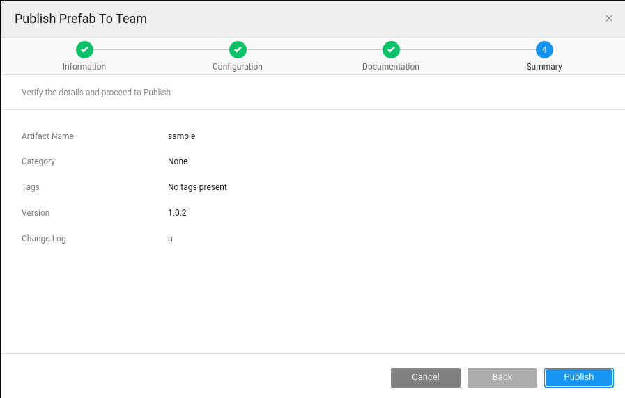1. Publish Info: This requires the Developer to enter the Category, Version, and Change Log. In case this Artifact uses or has a dependency on other Artifacts (for example, Project Shell using a Prefab), the dependencies are listed here.